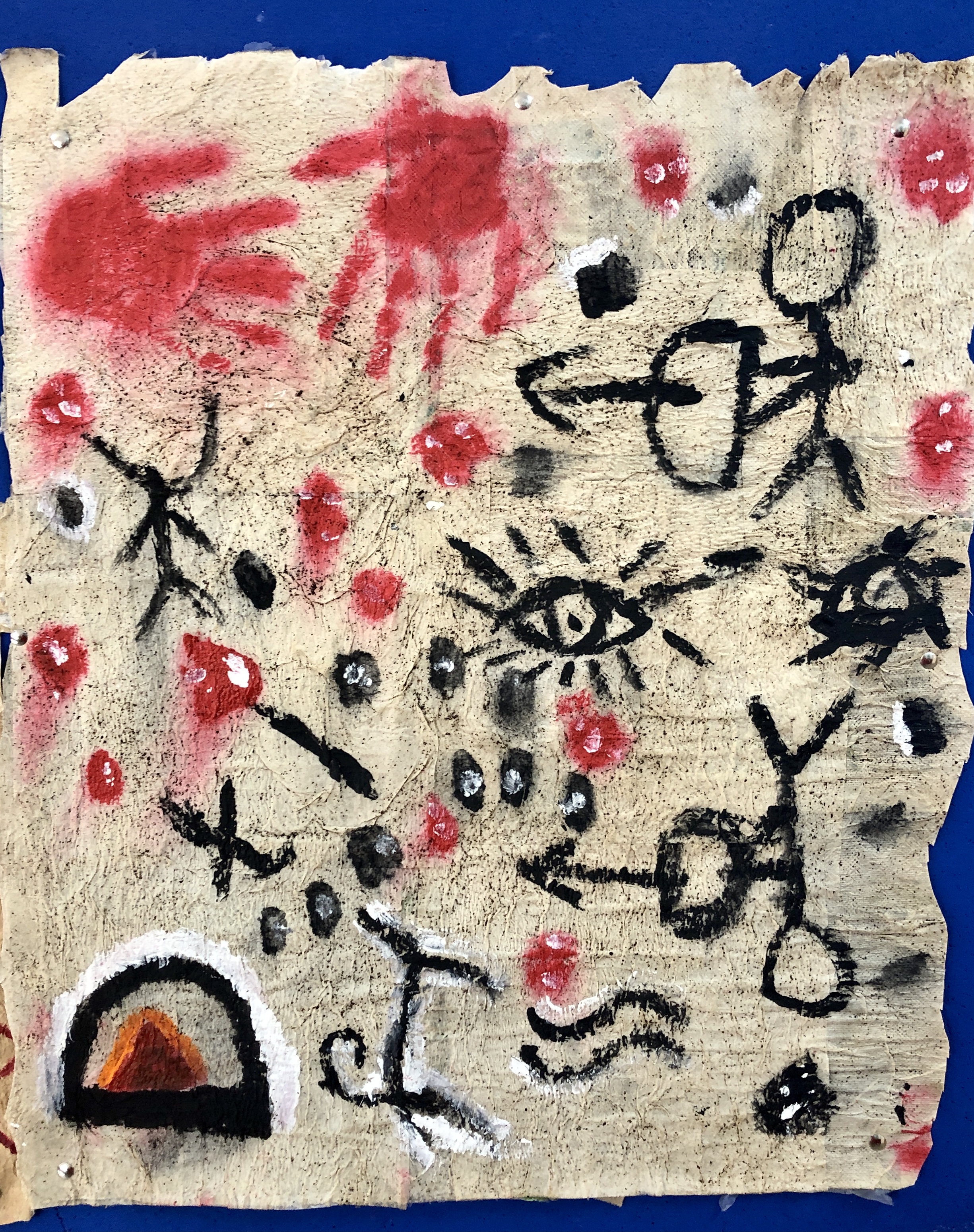 En primer lugar crearemos la base sobre la que pintar, para ello haremos una imitación de piel de animal, con papeles de periódicos y con cola. Una vez realizada esta imitación de cuero, intentaremos de envejecerla, aplicándole una mezcla de agua y café y por último plasmaremos nuestras obras de arte sobre ella, utilizando para ello diferentes tipos y mezclas de pinturas.