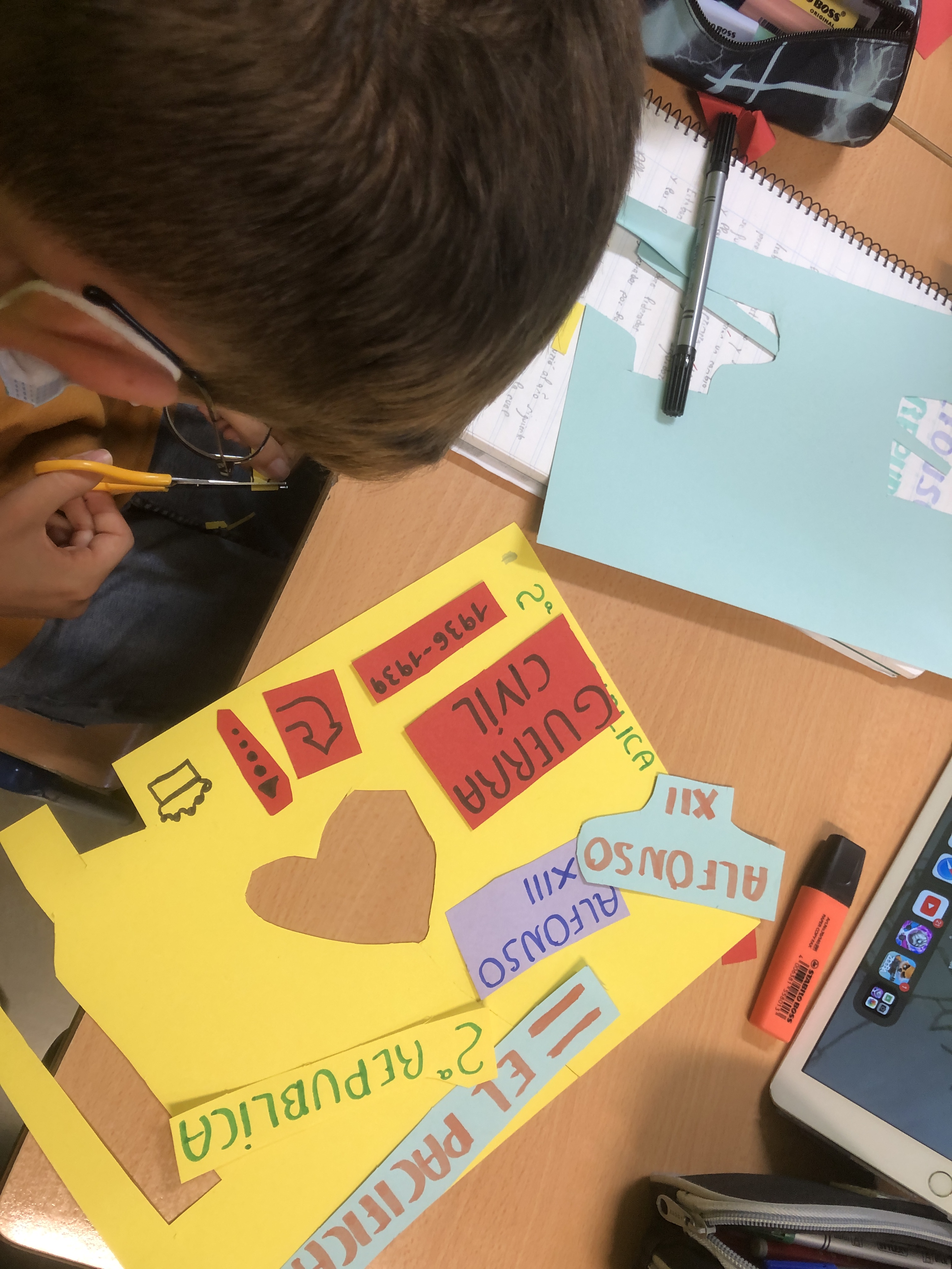 En los primeros cuatro periodos de esta fase nuestro alumnado debía leer una serie de artículos o visionar unos vídeos para ir descubriendo la historia de España y de esta forma contestar a las preguntas que le íbamos enviando. Pero, a partir del periodo V, la dinámica cambia, ahora deben realizar un producto final, mapa conceptual, visual thinking, pequeño montaje de vídeo, mindomo, Genial.ly, para demostrar que has comprendido la época estudiada.