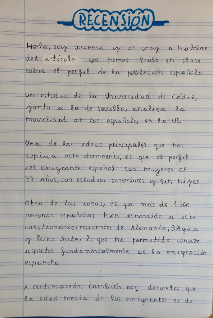 Para finalizar esta tarea el alumnado hubo de realizar una Recensión tras leer el artículo titulado: https://www.diariodecadiz.es/cadiz/perfil-emigrante-espanol-mujer-estudios_0_1505849972.html
