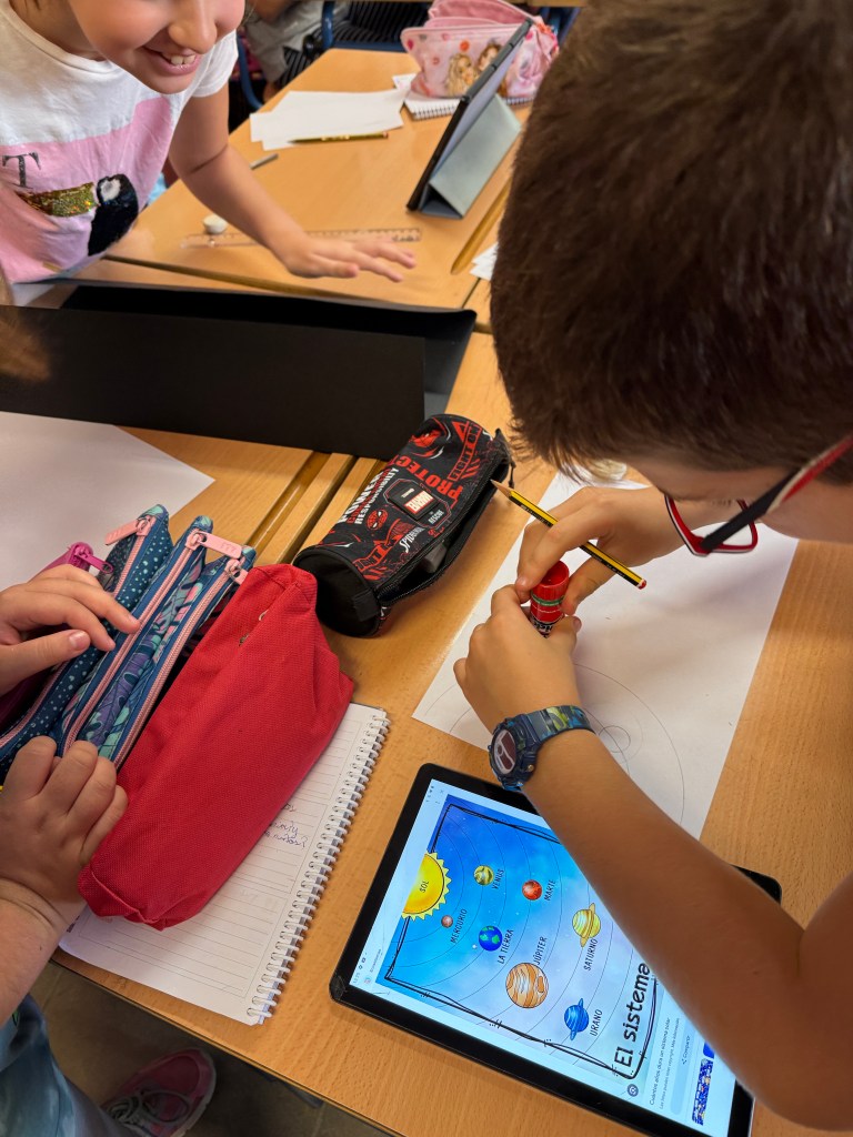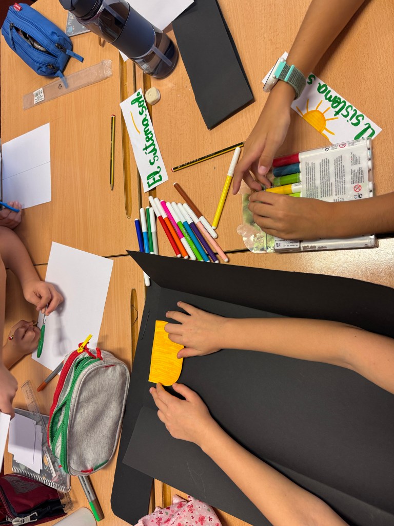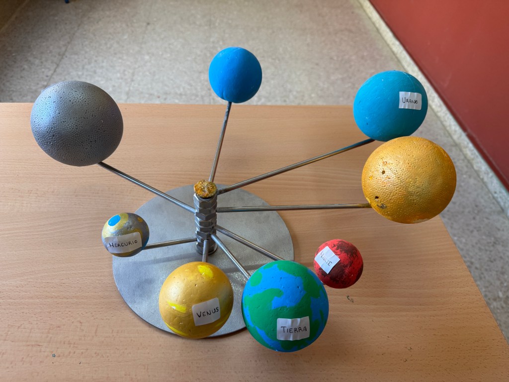 En esta fase pretendemos que nuestro alumnado piensa en qué forma podemos representar los movimientos que hemos visto que hacen los planetas en algo que construyamos nosotros.